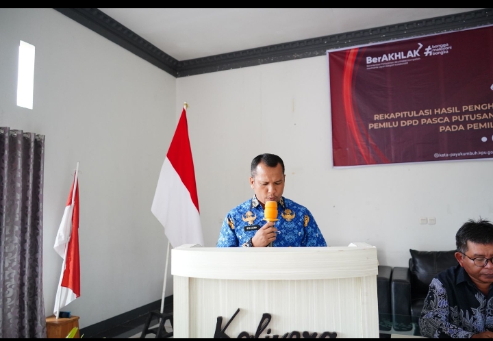 Payakumbuh, Kliksumatra. Com – Komisi Pemilihan Umum (KPU) Kota Payakumbuh menggelar Rapat Pleno terbuka Rekapitulasi Hasil Penghitungan Suara Pemungutan Suara Ulang (PSU) DPD Provinsi Sumatera Barat pasca putusan MK di Ballroom Hotel Kolivera III, Rabu (17/07/2024).