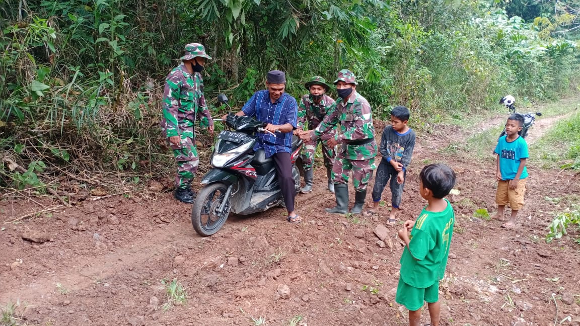 Personel Pra TMMD Ke 111 Satgas Kodim 0306/50 Kota Sertu Parjana bersama personel lainnya berusaha membantu mobilisasi kendaraan warga yang mau melintas dengan harapan tidak terjadi sesuatu hal yang akan merugikan bagi warga itu sendiri.