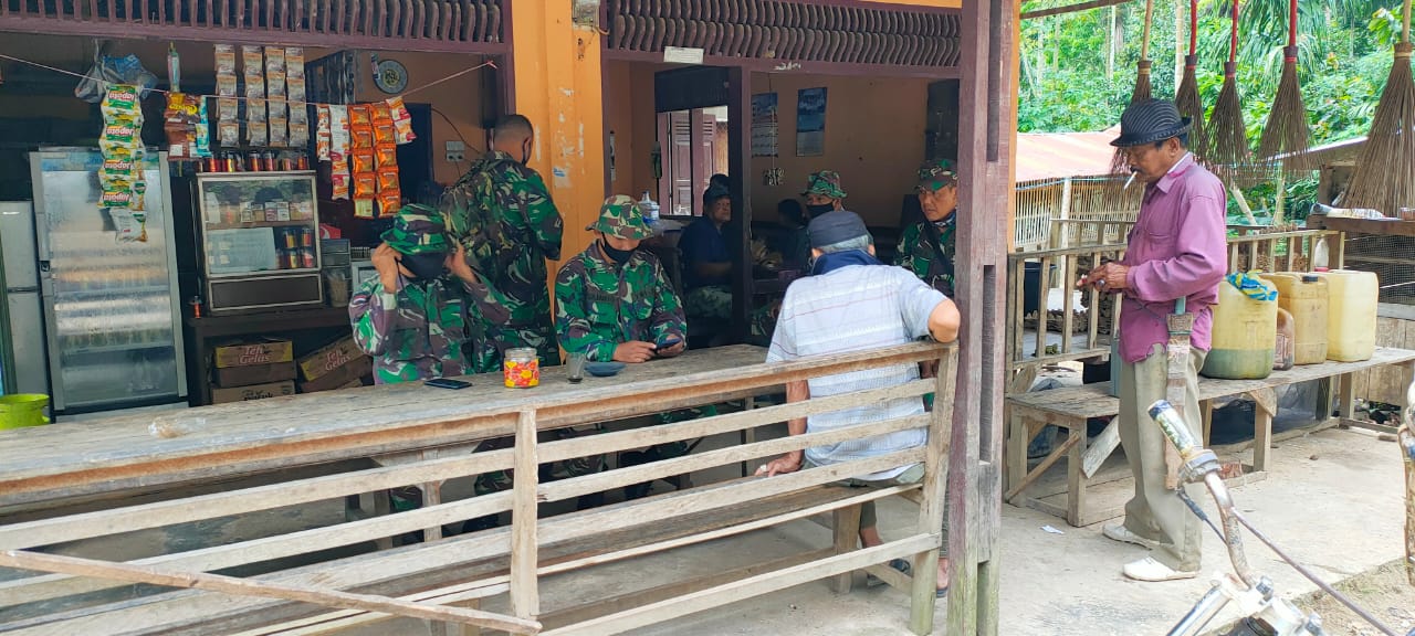 Dengan segelas kopi yang dipesannya, Serda Yusuf nampak asyik bercengkerama dengan bapak Lukman pemilik warung dan beberapa warga masyarakat lainnya. Serda Yusuf tak lupa menyelipakan pesan pesan teritorialnya kepada masyarakat, diantaranya tetap menjaga keamanan kampung dengan berdayakan siskamling dan mengaktifkan pos ronda.